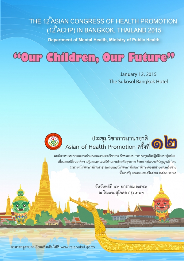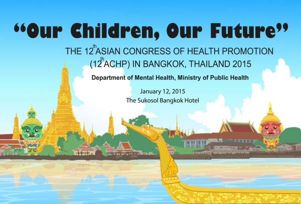 On Monday, January 12th 2015, Department of Mental Health will hold an International conference, THE 12th ASIAN CONGRESS OF HEALTH PROMOTION, at the Sukosol Hotel, Bangkok. In this conference, there will be a lot of academic lectures and presentations, exhibitions, and workshops in order to exchange participants knowledge and technology in terms of health promotion especially in the area of intellectual development. All academics and health personnel who work in the fields of public health and education from our networks both governmental and private sectors are welcomed. Additionally, Thai participants could acquire good opportunities to meet and discuss with many specialists from abroad, such as Japan, Korea, Taiwan, and China.