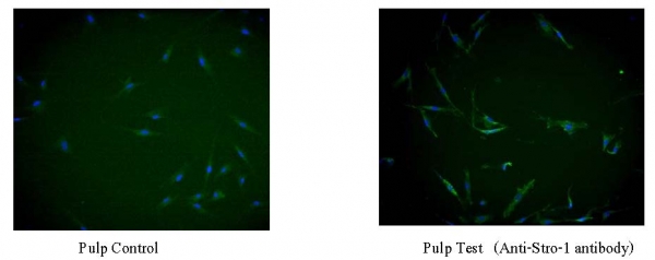 When cultured stem cells were smeared by immuno-fluorescence using antiStro-1 antibodymarker, it was found that stem cells from dental pulp had cells with Stro-1 marker expression but none from the alveolus as illustrated in picture1 and 2.