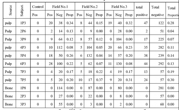 Samples in the study of dental pulp consisted of female aged 17, 22, 24 and 25 years old with the average of 22.00 + 3.55 years and male aged 26, 35 and 41 years old or average of 34.00 + 7.54 years. For alveolus samples were one female, 17 years of age and 2 male aged 27 and 68 with average age of 47.50 + 28.99 years.