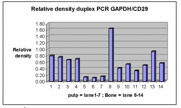 bar graph illustrating relative density between CD29 and mRNA GAPDHBar graph 1 - 7 were stem cells extracted from tissues of dental pulp while bar graph 8-14 showed alveolus ones.